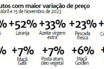 Já na laranja, a subida foi de 72 cêntimos por quilo (mais 52%). A 15 de novembro, um quilo de laranja custava 2,09 euros. No azeite virgem extra, o aumento foi de 33%. A 15 de novembro, uma garrafa de 75 centilitros custava já 10,01 euros, mais 2,49 euros do que na véspera da entrada em vigor do IVA zero.